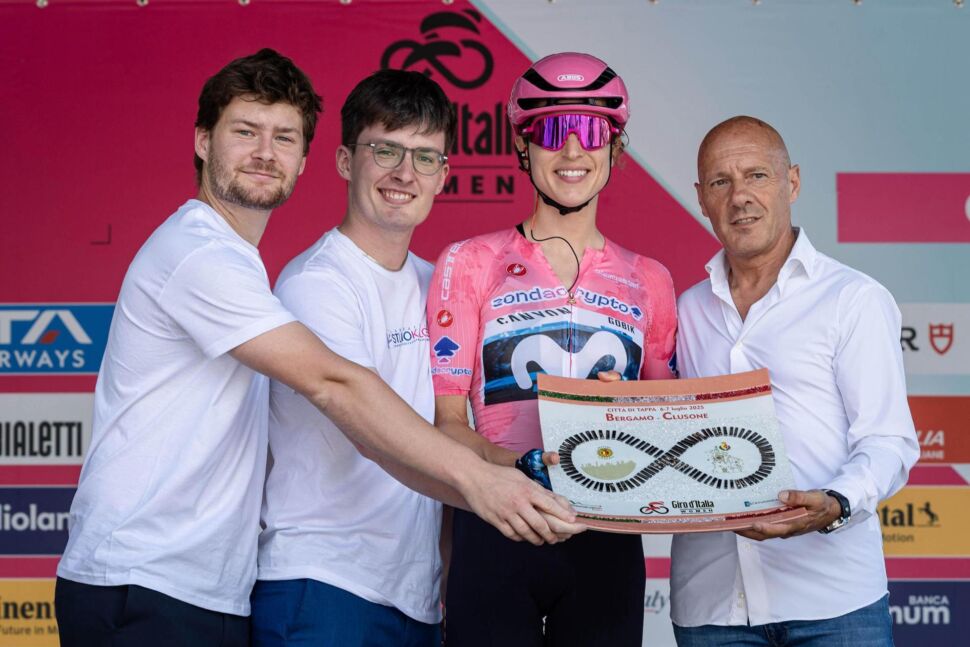 Il premio consisteva in un plateau in glass fusing che celebra il trionfo sportivo di Reusser, rappresentando i colori della bandiera italiana e l’iconico simbolo dell’infinito del Giro d’Italia, un omaggio esclusivo che ha entusiasmato tifosi e partecipanti.