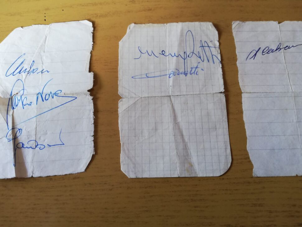 “Abitavo a Villongo e un giorno avevo marinato la scuola per andare a Sarnico per vedere l’allenamento dell’Atalanta. A bordo campo i giocatori erano stati ben disposti a firmare il loro autografo. Conservo come una preziosa reliquia questi foglietti con le firme di Mereghetti, Nova, Colombo, Gardoni, Milan, Nielsen. La gran parte di loro giocarono e vinsero la finale di Coppa Italia. Tra questi preziosi ricordi mantengo anche il biglietto di entrata allo stadio per la partita Malines-Atalanta“.