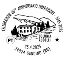 L’annullo in formato ovale orizzontale riproduce la stilizzazione della “Colonia Rudelli”, luogo simbolo della lotta partigiana, ed è completato dalla scritta “Celebrazioni 80° Anniversario Liberazione – 1945-2025 – 25.4.2025 – 24024 Gandino (Bg)”.