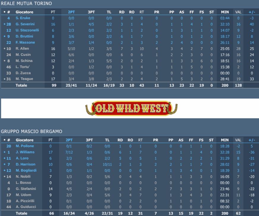 BASKET TORINO: Schina 12 (2/4, 1/3, 5/5, 3 ass.), Teague 17 (3/4, 3/8, 2/3, 5 ass.), Severini 16 (1/1, 4/5, 2/2), Allen 16 (5/10, 1/2, 3/5, 10 r., 4 rec.), Bruttini 8 (3/6, 2/2 tl, 7 r.); Massone 9 (3/7, 1/4, 4 ass.), Stazzonelli 6 (2/3, 2/2 tl, 3 ass.), Eruke, Tortù 3 (1/2 da 3, 5 f.), Zucca NE, Cusin 12 (6/6, 6 r.). Coach: Paolo Moretti.