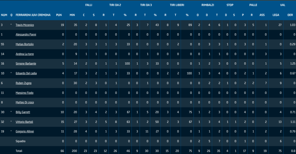 JUVI CREMONA: Billy Garrett 10 (2/3, 1/5), Gregorio Allinei 11 (1/3, 3/11), Travis Mcconico 19 (1/4, 3/7), Vittorio Bartoli 15 (5/8, 1/2), Edoardo Del Cadia 4 (1/3, 0/0); Ruben Zugno (0/1, 0/1), Andrea La Torre 0 (0/0, 0/1), Simone Barbante 5 (1/1, 1/3), Matias Bortolin 2 (1/3, 0/0); NE Matteo Di Croce, Alessandro Panni, Massimo Fiodo. Coach: Luca Banchi.