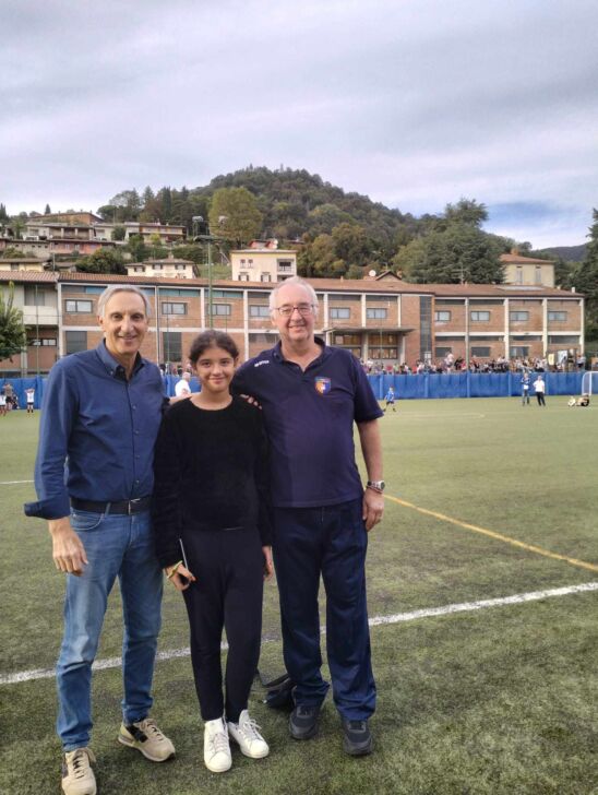 Nelle nude cifre, il riscontro di partecipazione a pelo d’erba artificiale (si giocava in cinque contro cinque) e sulle tribune. Alla fine ne sono usciti festanti ben 68 atleti e 200 spettatori, tra cui genitori e familiari stretti dei baby calciatori. Il saluto di benvenuto è stato affidato al grande Marino Magrin (nella foto, col responsabile organizzativo alzanese Maurizio Mangili e sua figlia Chiara), quello che nell’Atalanta anni ottanta tirava la bomba, e il vicario parrocchiale locale don Luciano Manenti.