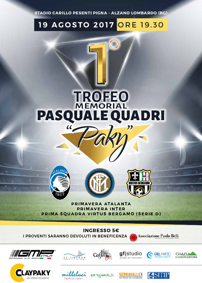 Il 19 agosto 2017 alle 19.30 presso lo Stadio Carillo Pesenti Pigna di Alzano Lombardo si svolgerà 1° Trofeo Memorial Pasquale Quadri “Paky”, in memoria di Pasquale Quadri, scomparso nel 2014, già fondatore e presidente della Clay Paky SpA, imprenditore di successo, a capo di un’azienda leader mondiale dell’illuminazione scenografica.