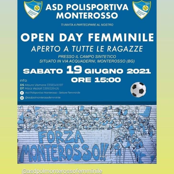 La Polisportiva Monterosso ti invita a partecipare all’Open Day Femminile, aperto a tutte le ragazze. L’Open Day si svolgerà sabato 19 giugno dalle 15 presso il campo sintetico di via Acquaderni, a Bergamo.