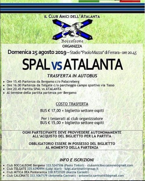 Pronti, partenza, via. Il Club Amici dell’Atalanta di Boccaleone s’è messo subito a capo della macchina organizzativa della prima giornata di campionato, che vedrà impegnati i nerazzurri a Ferrara domenica 25 agosto contro i padroni di casa della Spal. La sezione cittadina, coadiuvata da altre sezioni sorelle del circondario del capoluogo, s’è attivata per la trasferta in corriera di associati (2 euro di sconto sui 17 del pacchetto, escluso il biglietto della partita a carico dei singoli) e semplici simpatizzanti. Ecco la locandina preparata per l’occasione con referenti e contatti.
