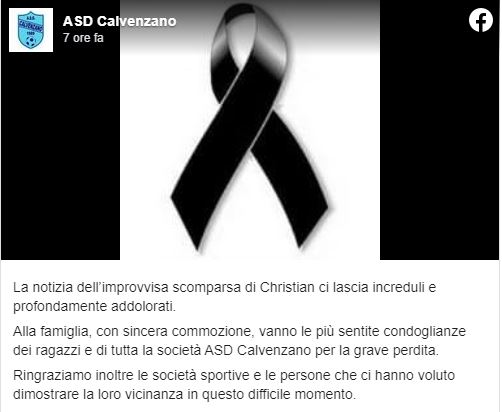Alla famiglia, con sincera commozione, vanno le più sentite condoglianze dei ragazzi e di tutta la società ASD Calvenzano per la grave perdita. Ringraziamo inoltre le società sportive e le persone che ci hanno voluto dimostrare la loro vicinanza in questo difficile momento”, recita la nota del club.