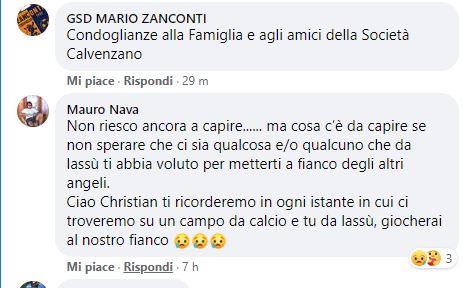 “Non riesco ancora a capire…… ma cosa c’è da capire se non sperare che ci sia qualcosa e/o qualcuno che da lassù ti abbia voluto per metterti a fianco degli altri angeli. Ciao Christian ti ricorderemo in ogni istante in cui ci troveremo su un campo da calcio e tu da lassù, giocherai al nostro fianco”, le accorate parole del mister. “La notizia dell’improvvisa scomparsa di Christian ci lascia increduli e profondamente addolorati.
