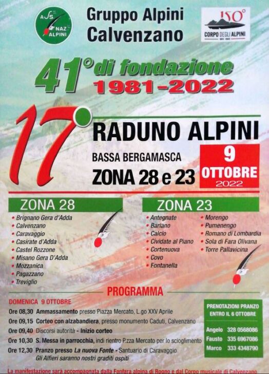 Calvenzano – Dopo la Festa Alpina del mese di settembre, finalmente in presenza, torna un appuntamento storico per le Penne Nere di Calvenzano. La festa, rimandata nel 2021 causa restrizioni covid, vedrà il Gruppo presieduto da Angelo De Stefani organizzare il 17esimo Raduno di Zona 23 e 28 che quest’anno si associa ai primi 41 anni del Gruppo calvenzanese.