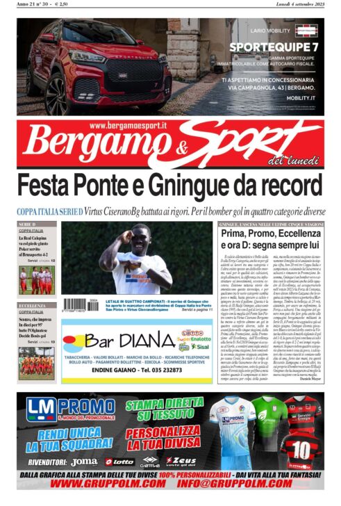 Favola calcistica in copertina in questo numero di Bergamo & Sport che potete acquistare dal vostro giornalaio di fiducia o tramite la nostra edicola digitale cliccando su www.bergamoesport.it/abbonamenti dalle sei di mattina. La storia bellissima è quella di El Hadji Gningue, attaccante classe 1995, ora in forza al Ponte San Pietro, in Serie D, dopo un’ascesa continua iniziata in Prima con la maglia del Gorle, arrivata in Promozione con la casacca della Gavarnese, continuata in Eccellenza con i bianconeri della Forza & Costanza. Cinque stagioni, quattro salti, montagne di gol, l’ultimo ieri alla Virtus CiseranoBergamo nel derbissimo di Coppa Italia vinto ai rigori dai Blues. Sul nostro giornale si raccontano favole bellissime, ma anche tutte le partite giocate dai nostri dilettanti in questo fine settimana (e che imprese che hanno firmato ieri Real Calepina, Scanzo, Zingonia Verdellino, AlbinoGandino, Calusco, Fara Olivana, Zanica, Lallio, Atletico Villongo e Pianico). Ampio spazio ai tornei, dal Ceresoli, al Preda passando per il Mondonico, kermesse giovanile da applausi a San Pellegrino Terme vinta dai baby d’oro dell’Atalanta. I soliti approfondimenti, questa volta sul successo della Dea sabato sul Monza, sul Calcio Albano, sulla Polisportiva Comunale Ghisalba e sull’Arabesque Danse Pedretti, quindi il racconto delle gare di ciclismo giovanile, con le corse a Spirano e a Clusone che hanno regalato emozioni a raffica ai numerosi spettatori. Che altro dire? Il solito: non importa dove, non importa quando, ma comperate Bergamo & Sport!!!
