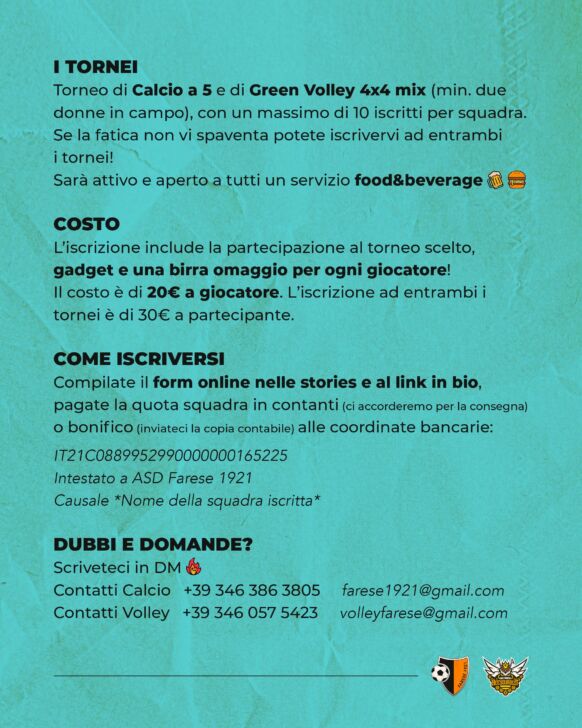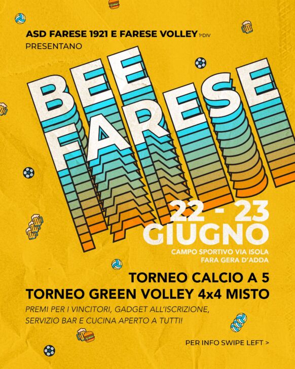 Inoltre nei giorni 22 e 23 giugno a Fara, in collaborazione con la squadra di pallavolo, la società organizza un torneo di calcio a 5 e beach volley 4×4 con premi per i vincitori e servizio bar e cucina aperto a tutti.