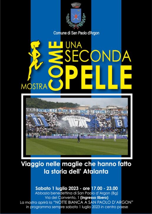 Sabato 1 luglio a San Paolo D’Argon aprirà la notte bianca la mostra “Come una seconda pelle”, un viaggio alla scoperta delle maglie più iconiche della storia atalantina. L’evento si terrà dalle 17:00 alle 23:00 all’abbazia benedettina in via del convento 1. L’ingresso è libero per tutta la serata.