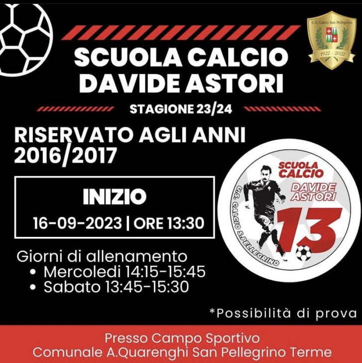 Anche per quest’anno il San Pellegrino apre la sua Scuola Calcio dedicata a Davide Astori. Gli allenamenti si terranno di mercoledì e di sabato per le annate 2016-2017. Per altre info leggere qui sotto: