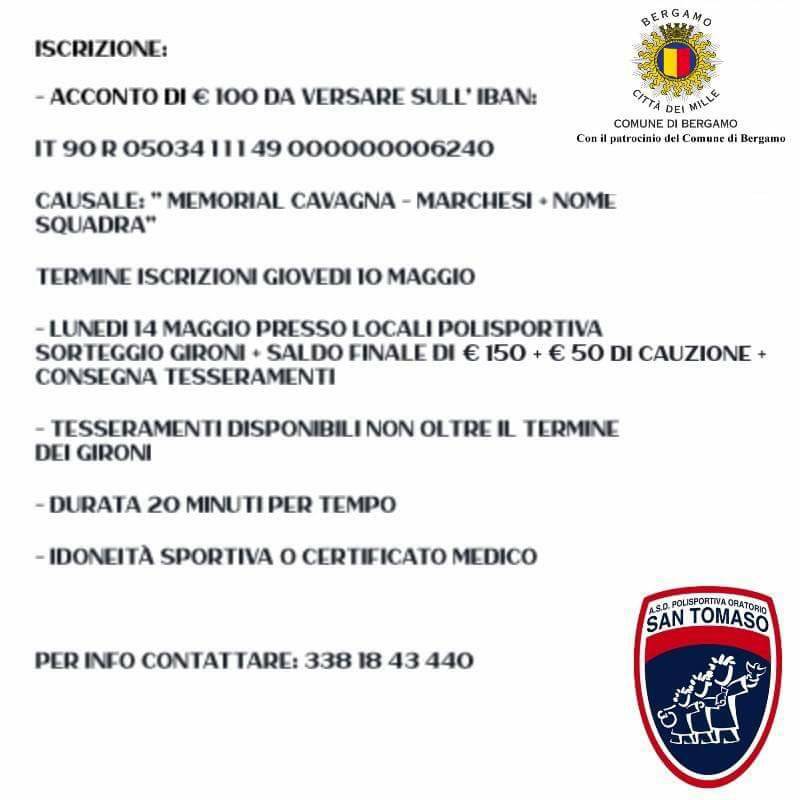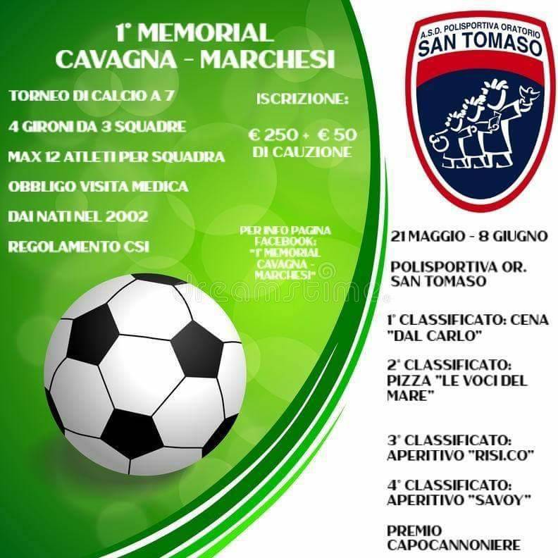 La Polisportiva Oratorio San Tomaso organizza il 1° Memorial Cavagna-Marchesi, torneo di calcio a 7. Il torneo si disputerà dal 21 maggio all’8 giugno. Tutte le info le trovate nelle due locandine qui sotto.