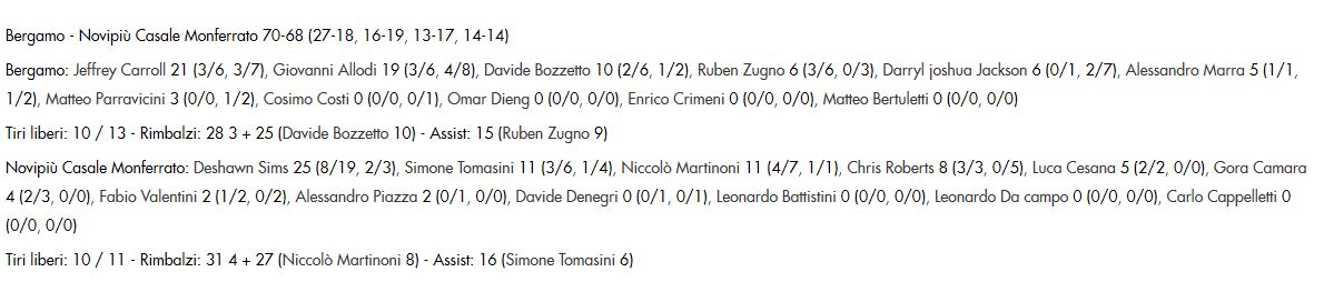 La capolista non ci sta, torna immediatamente a -2 con Tomasini e Sims, Bergamo replica con Bozzetto, autore di cinque preziosi punti in fila (50-45 al 24’). Casale però è attaccata, la gara resta vibrante nonostante le percentuali calino, Cesana impatta con un gioco da tre punti a quota 54 prima che Allodi chiuda il quarto (56-54 al 30’). Bergamo tiene il vantaggio nonostante Casale la mette sulla fisicità (60-58 al 34’), le percentuali crollano anche perché le squadre sono comprensibilmente stanche; Sims fa -1 con tre minuti sul cronometro, la difesa degli ospiti è asfissiante, Sims replica a Zugno per il 64-63 con cui si entra negli ultimi 2’ di gioco. È ancora Sims il protagonista, la sua tripla vale il 66-66, Carroll dalla lunetta è preciso per il nuovo +2 interno, la difesa giallonera cancella il tentativo di Sims e Bergamo ha il pallone per chiudere i conti. La tripla di Zugno però non va a bersaglio, Casale trova con Tomasini i tiri liberi dell’aggancio a 16” dalla fine e sull’ultimo possesso è Allodi che si prende la scena con la penetrazione ed il lay-up che valgono il +2 quasi ad 1” dalla sirena. Casale affida l’ultima preghiera a Tomasini, ma la sua tripla si infrange sul ferro, al PalaAgnelli finisce 70-68 in favore di Bergamo.
