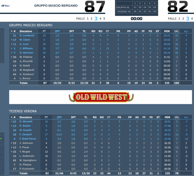 Partita condotta nella prima frazione da Bergamo, avanti 17-16 alla fine del primo quarto e poi sopra di tre/quattro possessi per tutto il secondo periodo, con vantaggi anche di nove punti, spinta dai canestri degli americani Harrison e Williams e di Loro, andando al riposo sul 36-29. Terzo periodo nettamente favorevole a Verona, che ha uno Zampini superbo ad alzarsi dalle riserve, e piazza un parziale di 15-22, impattando sul 51-51 all’ultimo giro di boa del 30’. Ultimo quarto punto a punto, con Bergamo che che nell’ultimo minuto allunga sul 72-68 ma viene ripresa a fil di sirena sul 72-72. Poi il supplementare, con un Harrison ancora una volta ‘on fire’, con 30 punti, e intorno a lui un gruppo dove tutti sono protagonisti e portano il loro contributo con difesa, rimbalzi e punti.