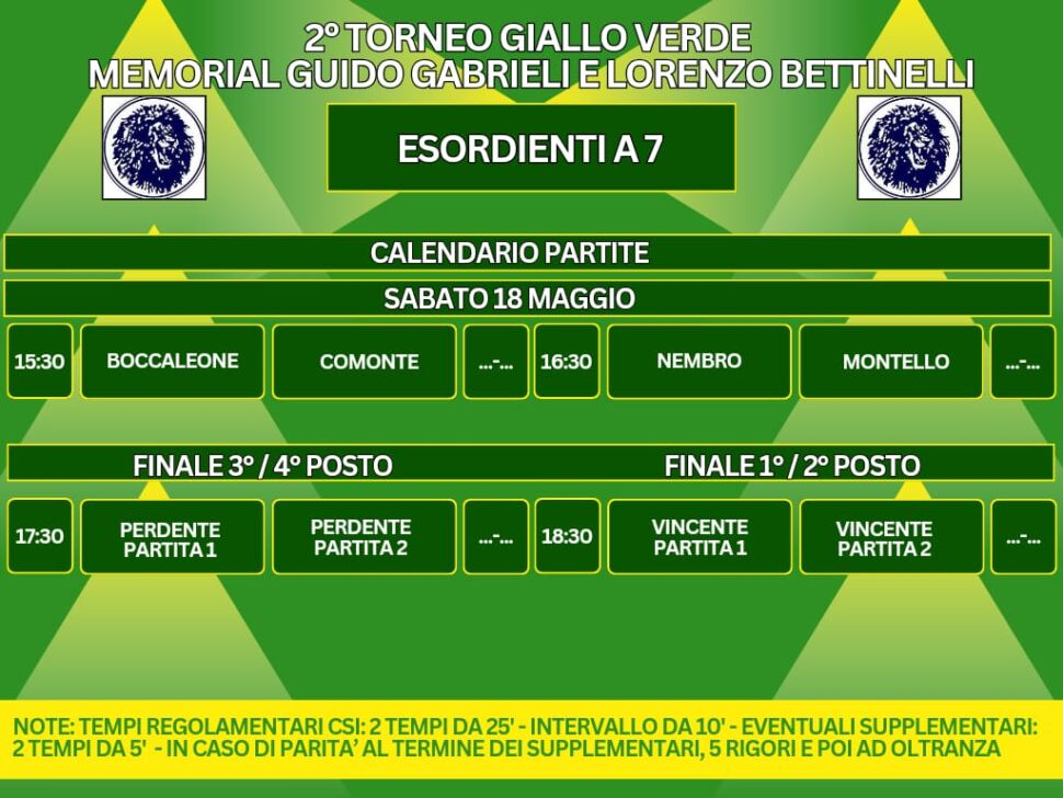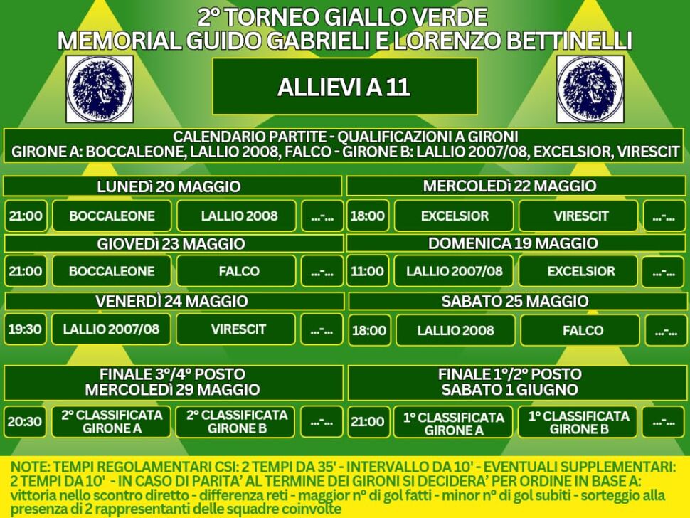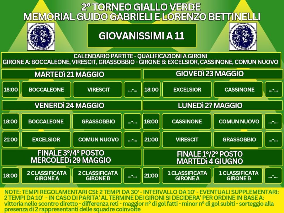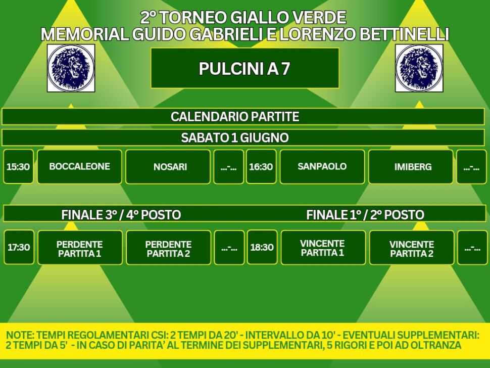 E’ in corso di svolgimento a Boccaleone il “Torneo Giallo Verde – 2° Memorial Gabrieli – Bettinelli”, istituito per ricordare i fondatori del club cittadino. La manifestazione è riservata a sei categorie (scuola calcio, Pulcini, Esordienti, Giovanissimi, Allievi e Terza Categoria) e si disputa presso il campo sportivo “Solfa e Pale” di via Rovelli. In questi giorni le fasi a gironi, a inizio giugno le fasi finali. Nelle locandine qui sotto le info dettagliate.