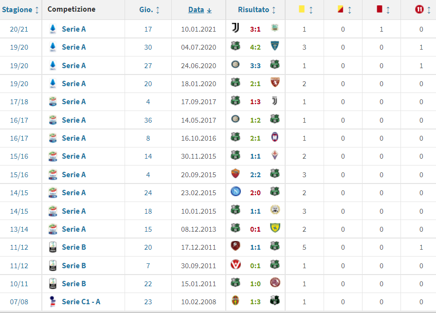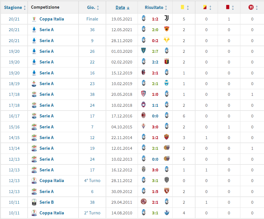 Per soprammercato, i neroverdi ospiti martedì sera al Gewiss Stadium di Bergamo hanno un bilancio favorevole col bancario della sezione Aia di Imperia e i nerazzurri tutt’altro. 7 vittorie a 6, 5 pareggi a 4 e 4 sconfitte a 9. In comune le due squadre hanno l’avversaria diretta dallo stesso arbitro l’ultima volta: per l’attuale undici di Alessio Dionisi fu un ko per 3-1 a Torino il 10 gennaio scorso proprio coi bianconeri. Sotto, negli screenshot da Transfermarkt, il ruolino di marcia delle contendenti col fischietto ligure, assistito nell’occasione da Filippo Valeriani di Ravenna e Giuseppe Perrotti di Campobasso; quarto ufficiale il maresciallo Livio Marinelli di Tivoli; al V.A.R. Piero Giacomelli di Trieste e Filippo Meli di Parma.