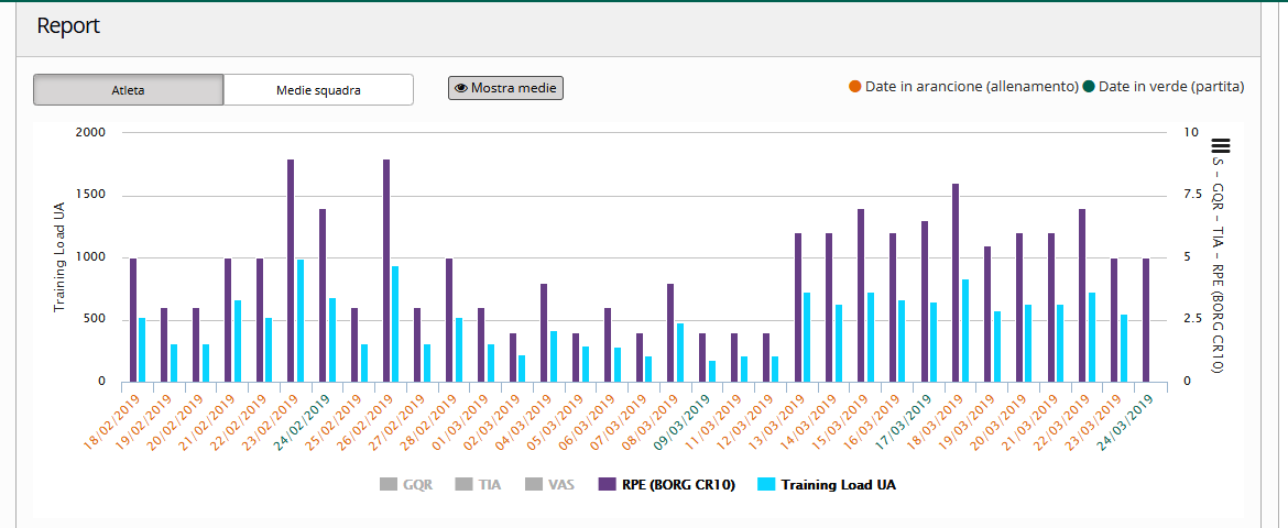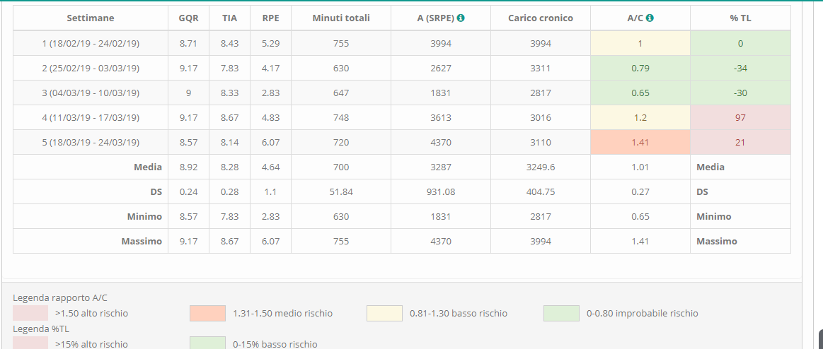 - I carichi di lavoro ATL (Acute Training Load ) e CTL(Chronic Training Load), singoli e di squadra, ove il rapporto tra questi (ATL/CTL) dovrà essere compreso tra un valore di 0.8-1.3 quale indice di basso rischio o se >1.5 indicherà un rischio infortunio molto più alto.