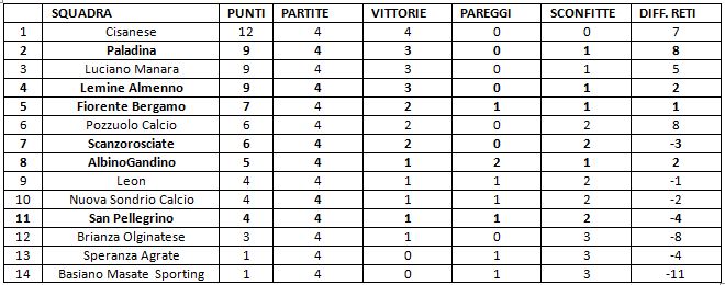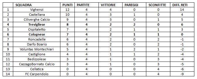 La Colognese brilla nel proprio fortino di casa e supera per 5-2 la Bedizzolese, decisive le reti di Ubbiali, Monterisi, Bonanno e la doppietta di Genova, i ragazzi di Giacomazzi si stanziano al sesto posto in classifica con la bellezza di 7 punti. La Trevigliese strappa un pareggio in casa della Castellana, seconda della classe, grazie alla rete del momentaneo vantaggio siglata da Ferrandi. La squadra di Calvi si trova al quarto posto con otto punti e una cavalcata pronta ad iniziare.