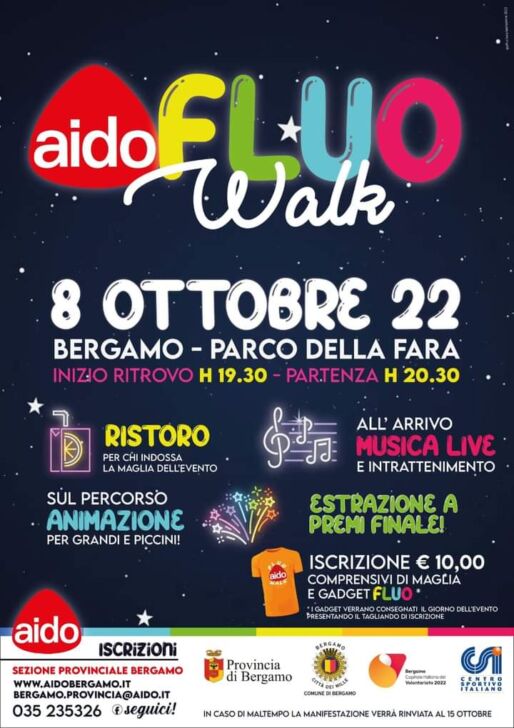 L’attesa è finita! La Sezione Provinciale di Bergamo dell’Aido ha organizzato la prima edizione della “Aido Fluo Walk”, camminata non competitiva serale che si svolgerà sabato 8 ottobre in Città Alta a Bergamo alle ore 20:30 con ritrovo ore 19:30 presso il Parco della Fara.