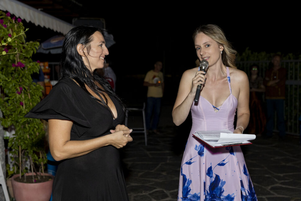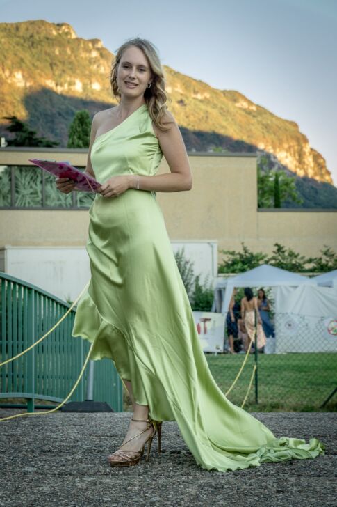 La presentatrice Mariangela Vanalli vestita da Jorida Bregasi