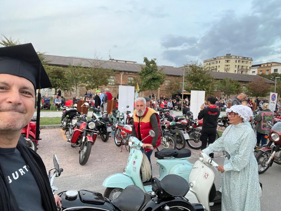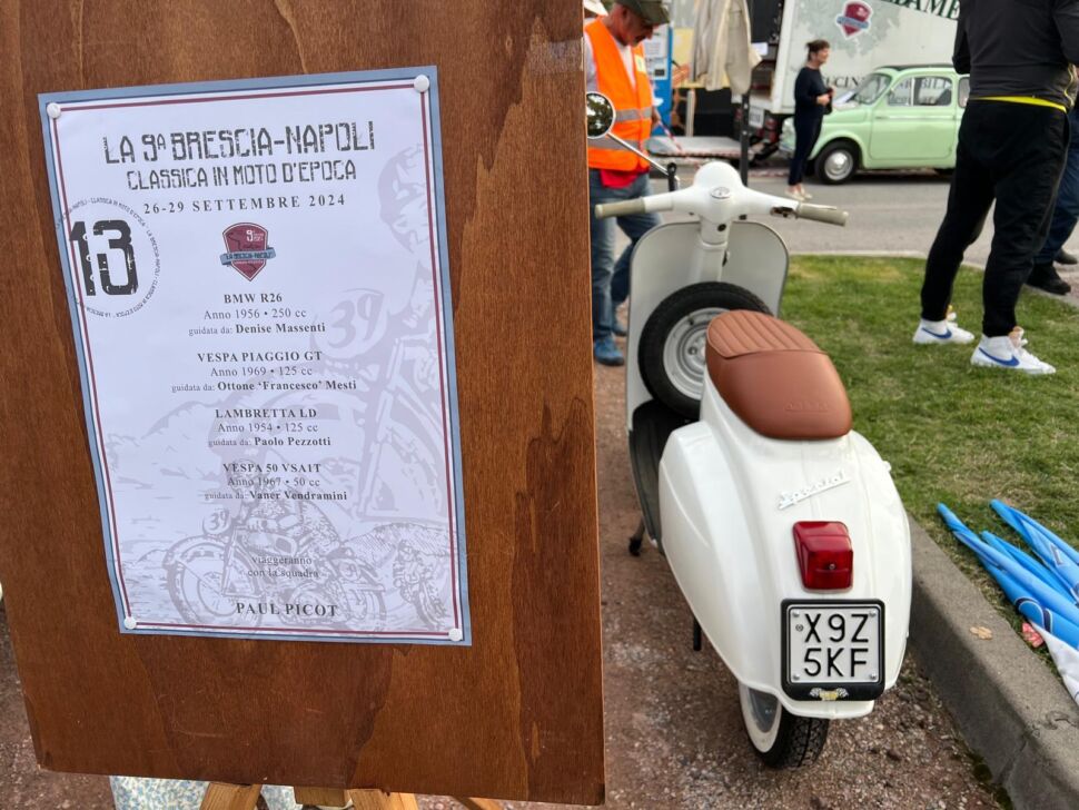 “Prima s’è rotto il fusibile della Bmw R26 di Denise Massenti, a Peschiera del Garda. Quindi, il filo dell’acceleratore della Vespa 50 VSA 1T di Vaner Vendramini, a Verona, che poi ha pure perso un faro. Eppure a Ravenna abbiamo chiuso quarti su ventuno squadre la prima tappa”. Parole, musica e inizialmente accensione difficoltosa ma alla fine andata in porto, per la “Paul Picot” di Ottone Mesti, dirigente del nostro calcio e titolare di TempJob che in sella alla sua Vespa 125 GT del ’69 ha capitanato il team completato da Paolo Pezzotti su Lambretta LD: “Metà di noi senza guasti, una piccola vittoria da festeggiare a tavola”.