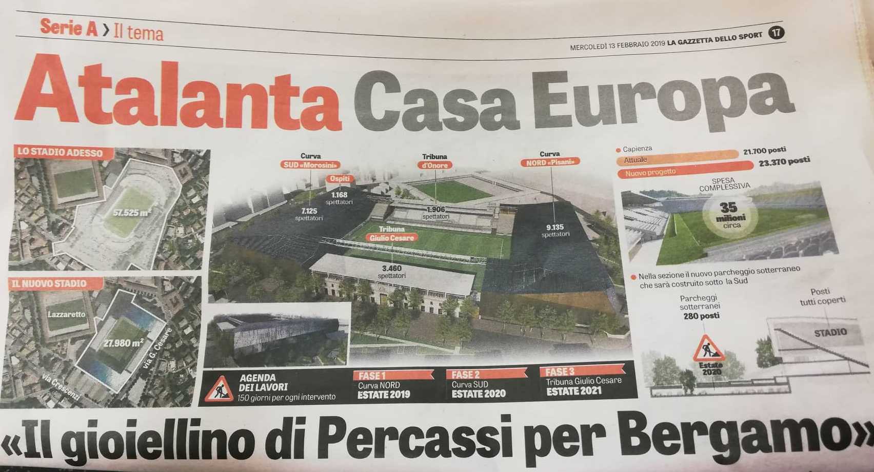 E i lavori? Imminenti, la fase uno, la nuova Nord si farà dal 28 aprile, con l’Atalanta che giocherà le ultime due partite casalinghe lontane da Bergamo. Un’estate di lavori, poi l’appuntamento al maggio del 2020, quando si abbatterà la Sud per rifarla nuova di zecca, quindi la conclusione con il rifacimento della tribuna Giulio Cesare nel giugno del 2021. A settembre di quell’anno il gioiellino sarà completato.