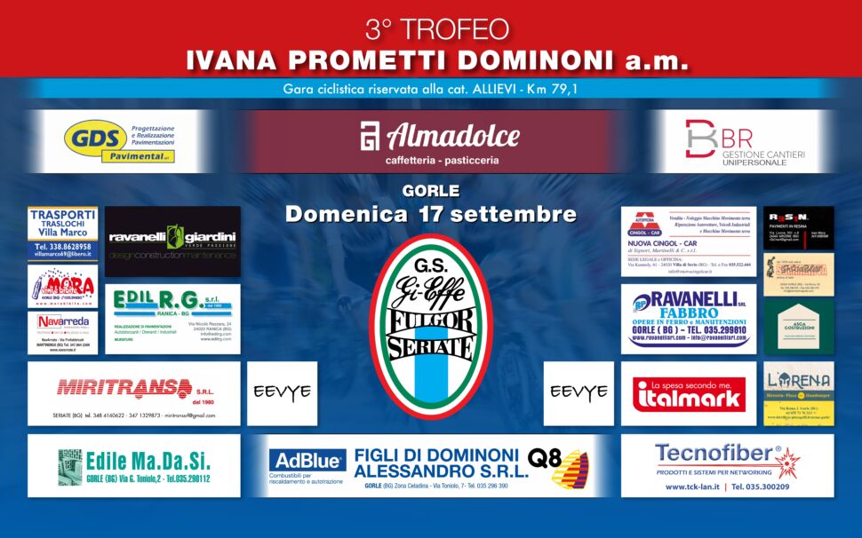Giovedì 14 settembre presso l’Arena di Gorle si è tenuta la presentazione del 3° Trofeo Ivana Prometti Dominoni a.m. che si correrà su un circuito con partenza e arrivo a Gorle domenica 17 settembre, gara riservata agli Allievi. Il percorso di 79,1 Km viene ripetuto più volte e l’ultimo giro comprende la salita al Colle dei Pasta. La serata è stata condotta da Stefano Ravanelli Vice presidente della Gi-Effe Fulgor e coordinatore della manifestazione con al suo fianco il presidente Fiorenzo Nava. La partecipazione quest’anno è più che buona: alla prima edizione gli iscritti erano 67, quest’anno sono 123 in rappresentanza di 23 società. Questi i numeri della gara ricordati da Aldo Epis responsabile provinciale della categoria Allievi che ha aggiunto che delle tre gare in programma domenica per gli Allievi in Lombardia questa ha il maggior numero di iscritti.. Più di settanta anche le persone coinvolte per garantire il perfetto svolgimento della manifestazione. Ravanelli ha quindi espresso il suo ringraziamento, prima di tutto alla famiglia Dominoni, in particolare papà Antonio e Manuel, all’amministrazione comunale di Gorle rappresentata dal consigliere con delega allo sport Renato Fabretti. Un grazie anche a Claudio Mologni presidente del comitato di Bergamo della FCI, al consigliere federale Gianantonio Crisafulli che hanno portato il loro saluto, al comandante della Polizia locale di Gorle Massimo Brignoli. Il presidente della Gi-Effe Fulgor Fiorenzo Nava ha voluto poi ringraziare gli sponsor: “i lavori sulle strade ci obbligano a cambiare percorso. Ringrazio gli sponsor che ci sostengono, che sia una giornata felice per tutti.” Questa gara è anche la penultima prova del Memorial Donati che ogni anno premia il miglior Allievo bergamasco.