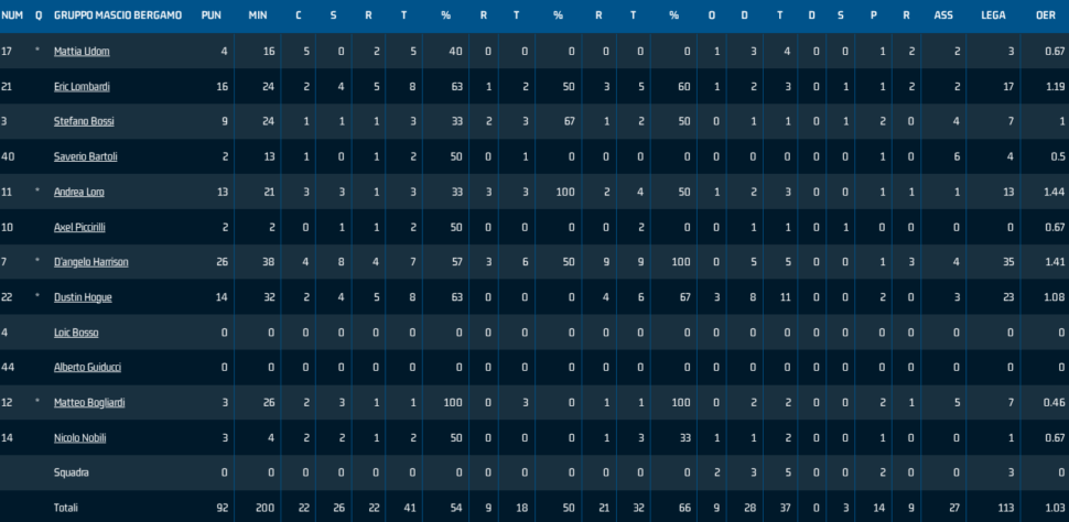 Una partita senza grandi scossoni, sempre controllata dalla squadra bergamasca, che ha chiuso il primo quarto sopra 25-24, ha vinto il secondo periodo 20-16 andando all’intervallo sul 49-45, ha chiuso avanti il terzo periodo col minimo scarto sul 67-66 e ha poi allungato nell’ultimo superando quota 90. Nella Gruppo Mascio, oltre ai 26 del tiratore scelto, ottima l’ala forte Lombardi a 16, quindi il centro Hogue a 14, l’ala piccola Loro a 13 e il regista e capitano Bossi a 9.