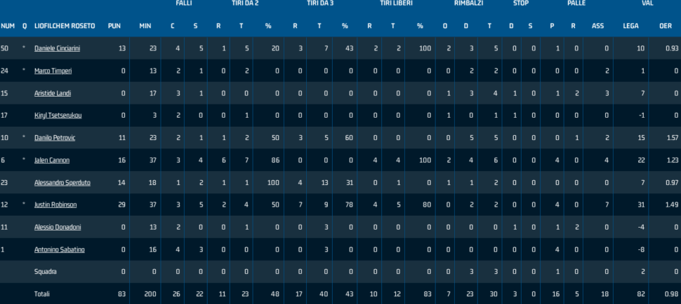 Cinciarini ha tenuto a galla gli ospiti nel primo tempo, ruolo assunto da Sperduto nella penultima passerella cronometrica, mentre Cannon alla distanza ha perso il duello con Hogue. Benissimo Eric Lombardi, sempre costante nel garantire punti, recuperi e difesa, mentre per Bartoli e Bogliardi i fuochi d’artificio in attacco sono rimandati.