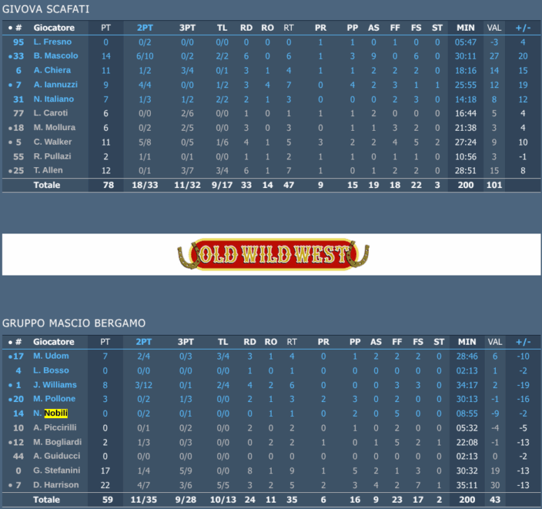 Note: parziali 18-12, 23-16, 17-24, 20-9. 5 Falli: Nobili 31’07” e Bogliardi 34’35”.