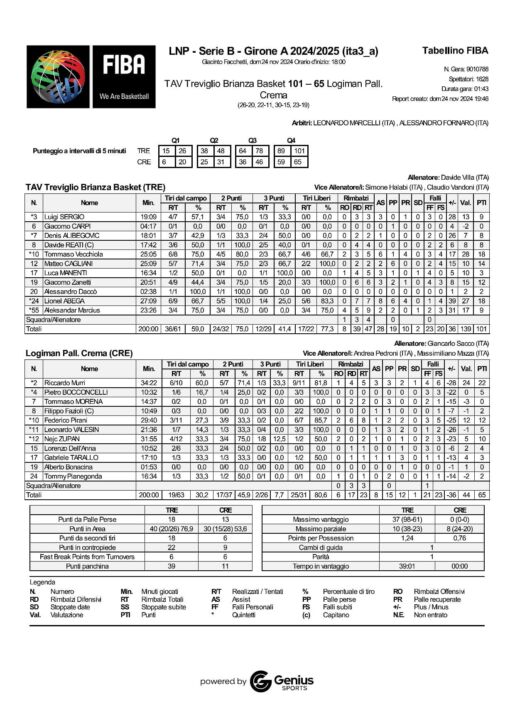 TAV Treviglio Brianza Basket: Tommaso Vecchiola 18 (4/5, 2/3), Lionel Abega 18 (5/5, 1/4), Luigi Sergio 9 (3/4, 1/3), Denis Alibegovic 8 (1/3, 2/4), Aleksandar Marcius 9 (3/4 da 2); Alessandro Daccò 2 (1/1), Giacomo Carpi (0/1 da 3), Matteo Cagliani 14 (3/4, 2/3), Davide Reati 8 (1/1, 2/5), Giacomo Zanetti 12 (3/4, 1/5). Luca Manenti 3 (0/1, 1/1). Coach: Davide Villa.