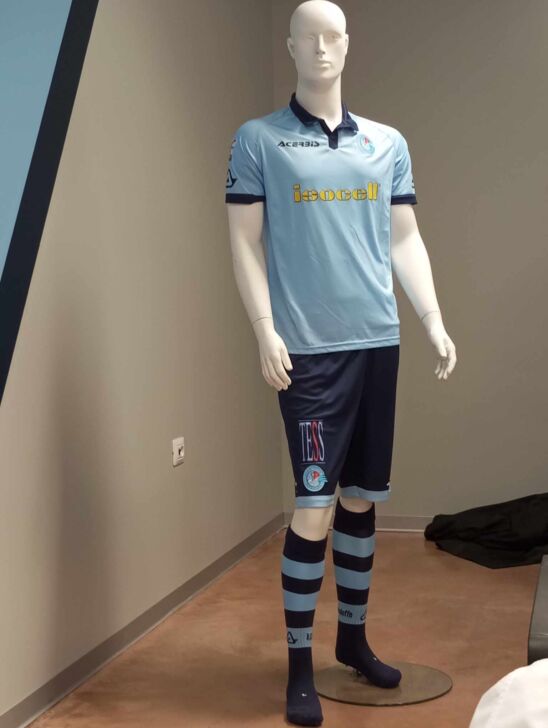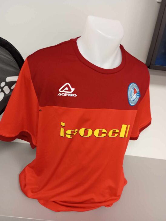 La personalizzazione è realizzata con il logo ACERBIS applicato in heat transfer sul petto e sulle maniche in colore nero, il logo interno collo stampato in sublimatico e la patch ricamata del club. Alla maglia si aggiungono i pantaloncini blu con bordi celesti e, sulla parte anteriore destra, il logo dello sponsor istituzionale Tess Italia le calze senza piede a righe orizzontali blu e celesti con logo ACERBIS in blu sullo stinco.