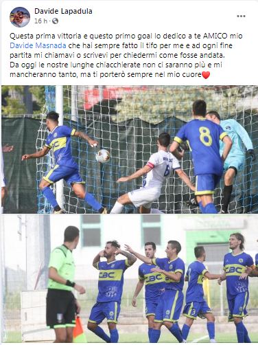 L’improvvisa scomparsa del Direttore Generale del Villa Valle, Davide Masnada, ha avuto vasta eco in tutto il mondo calcistico bergamasco. Uno dei suoi ragazzi, Davide Lapadula, al Villa nel 2017/18, ha voluto ricordarlo dedicandogli il gol con il quale il CazzagoBornato ha superato in trasferta il Rovato in Coppa Italia. Queste le parole del bomber, attraverso il suo profilo Facebook: “Questa prima vittoria e questo primo goal lo dedico a te AMICO mio Davide Masnada che hai sempre fatto il tifo per me e ad ogni fine partita mi chiamavi o scrivevi per chiedermi come fosse andata. Da oggi le nostre lunghe chiacchierate non ci saranno più e mi mancheranno tanto, ma ti porterò sempre nel mio cuore”.