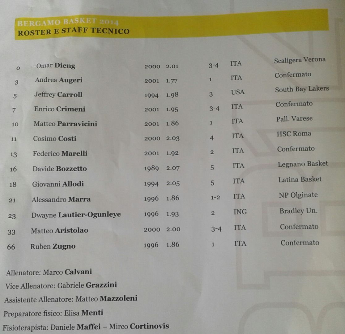 Le novità sono tante e tutte da sondare, al netto degli juniores. Un muscolare come Dieng, un centro d’esperienza come Allodi, scommesse come Marra e Costi. Sulla carta, la garanzia di una discreta rotazione a partita, di almeno 8-9 elementi. Prima amichevole a fine agosto a Bernareggio e il 4 si va dall’Assigeco Piacenza. La truppa giallonera è al lavoro da martedì 20 a Torre Boldone. Il mesw prossimo, l’8 alle ore 18 la Supercoppa ospitando l’Urania Milano, mentre il primo test casalingo è il 18 contro Biella.