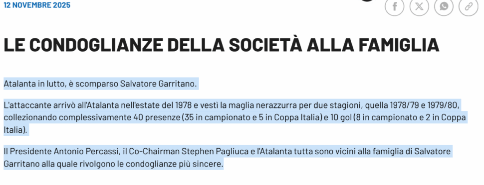 Non ce l’ha fatta, Salvatore Garritano, 10 gol in 40 presenze nell’Atalanta dal 1978 al 1980 tra A, B e Coppa Italia, a vincere la partita più importante. Affetto da molti anni da una forma cronica di leucemia, l’ex bomber degli anni settanta, nel palmarès anche l’ultimo storico scudetto del Torino nel 1976, s’è arreso stamani alla malattia. Avrebbe compiuto 70 anni il prossimo 23 dicembre.