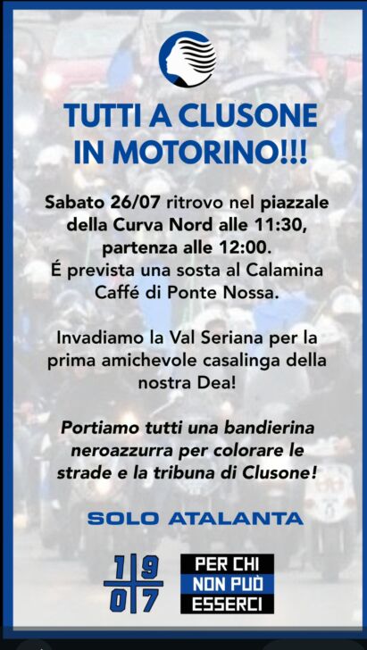 I tifosi della Curva Nord, infine, hanno organizzato il corteo in motocicletta in occasione della primissima uscita estiva della squadra, prevista sabato 24 luglio alle ore 17 allo stadio “Città di Clusone” gestito dall’omonima società del presidente Sergio Sforza contro l’Under 23 affidata a Salvatore Bocchetti. Nel manifestino a piè d’articolo, tutte le informazioni del caso. I biglietti restano acquistabili in prevendita su https://liveticket.it/cittadiclusone al costo di € 10,00 (+ € 1,00 per i diritti di prevendita). Da martedì 22 luglio e fino alle 12 di sabato 26 luglio, tagliandi fino a esaurimento anche al Bar Sport di via San Lucio 31, al Caffè Fanzago di via San Vincenzo de Paoli 13 e all’Osteria da Gepe di via Bernardino Baldi 15, tutti a Clusone. Nel giorno gara, i cancelli e le casse dell’impianto apriranno alle ore 15.