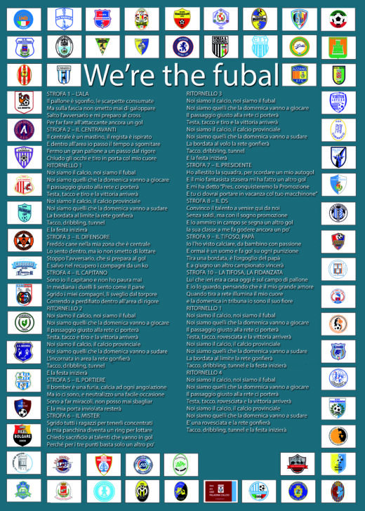 Ora sto imparando in redazione “We’re the fubal” con la mia bella chitarrina vintage (mentre Simone Fornoni scrive articoli su articoli) e domani sarò pronto a cantarla e a suonarla per voi in tutto il web conosciuto. Intanto ecco il testo che ho scritto e che faremo cantare ad almeno duecento tra presidenti, dirigenti, allenatori e calciatori del movimento bergamasco. Ditemi solo se il testo vi piace, o se invece cambiereste qualcosa, canticchiando l’inno sulle note di “We’re the world”. Siate buoni, ricordando che la vendita dei cd andrà interamente in beneficenza!