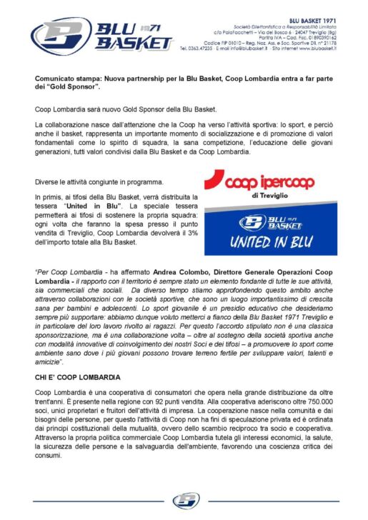 Il 3 per cento dell’importo della spesa direttamente alla squadra del cuore. Ipercoop Treviglio diventa Gold Sponsor della Blu Basket, gloria dello sport cittadino, ma non come supermercato di zona e basta. È Coop Lombardia, a significare l’importanza per il territorio del sodalizio nato dai Salesiani e diventati grande in A2, ad aver preso le redini dell’accordo di partnership col club del presidente Gianfranco Testa. Proponendo ai tifosi locali la tessera “United in Blu”.