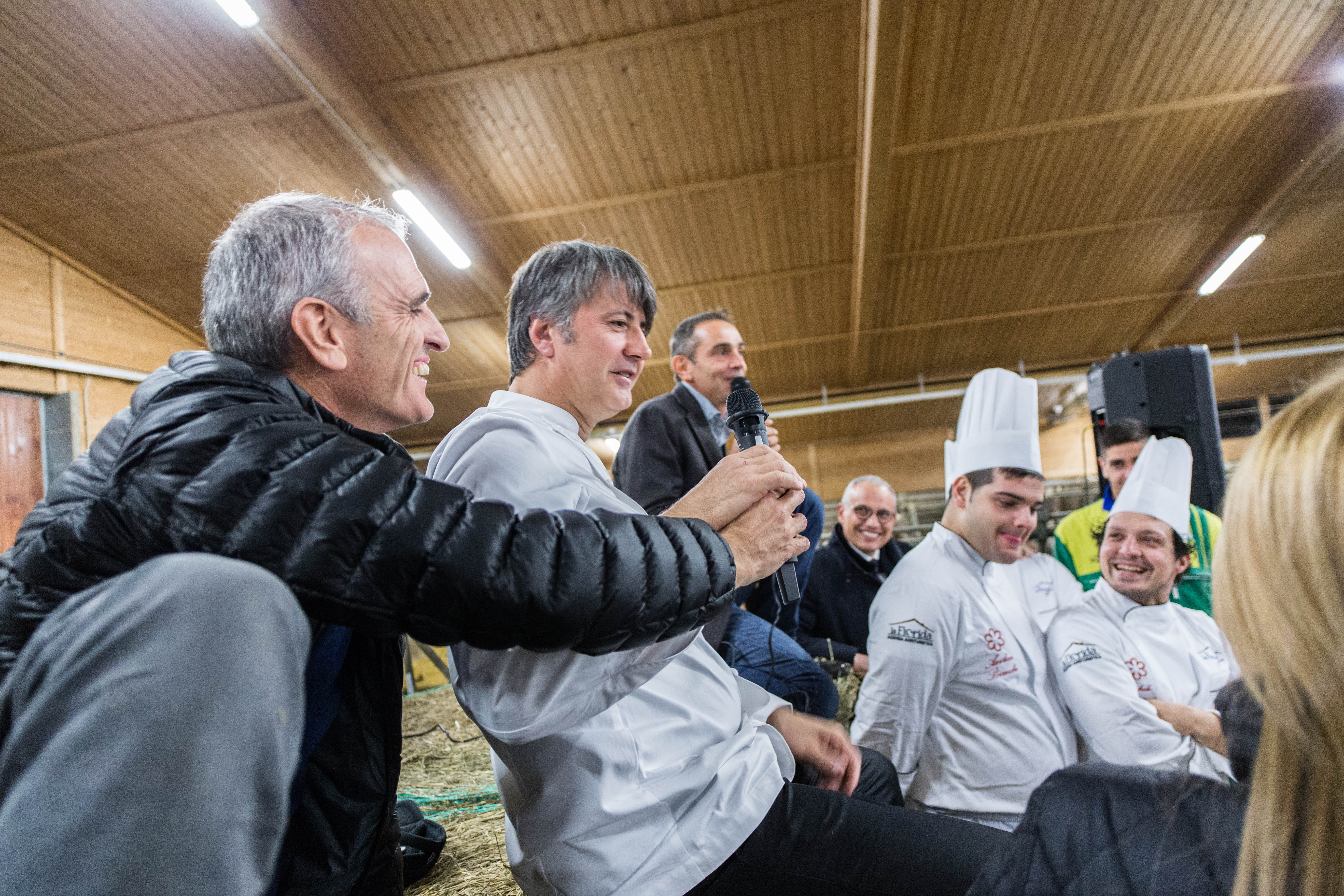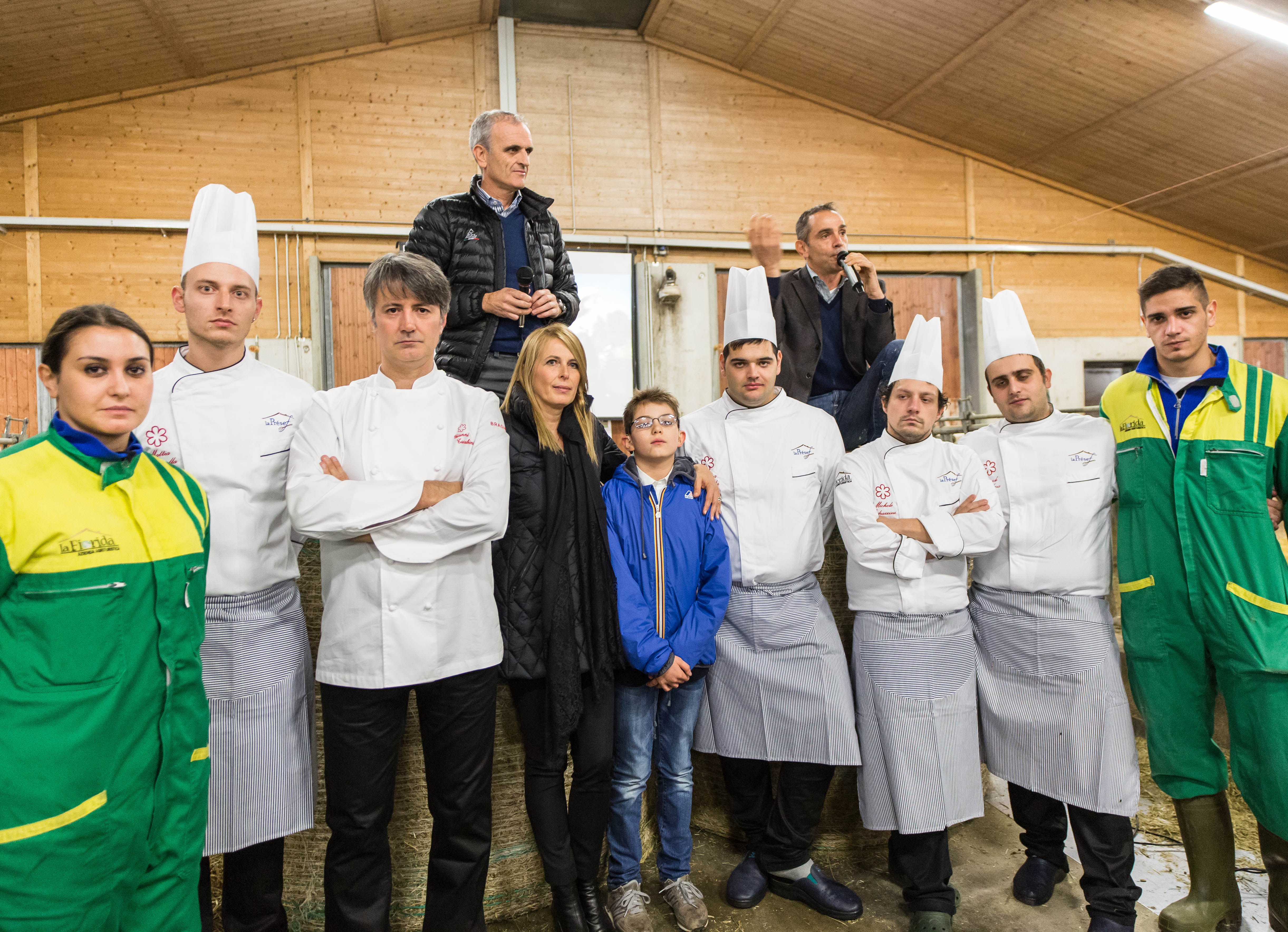 Mantello (So) – Un agriturismo da sogno, dove si mangia divinamente e dove vieni coccolato da persone che hanno a cuore gli ospiti del loro amato territorio: la Valtellina. Venerdì sera siamo stati a La Fiorida, incantevole fattoria di Mantello, in provincia di Sondrio. Con quasi duecento persone, abbiamo partecipato alla grande festa per la stella Michelin attribuita a inizio novembre al ristorante dell’agriturismo, la Preséf, che è entrato nella prestigiosa guida che annovera l’élite degli chef e delle cucine internazionali. La serata è cominciata con un percorso luminoso in ogni senso: guidati dalla luce delle fiaccole, abbiamo visto, tappa per tappa, la filiera, dalla terra alla tavola. Il fienile, i vitelli, la porcilaia, gli orti, i trattori, la stalla, il macello, il caseificio, la casera di stagionatura e infine la tavola: cura, passione, dedizione, impegno, qualità, innovazione e tante emozioni, questa l’aria che si respirava nelle spiegazioni dei fattori, dei casari, dei macellai. Molto coinvolgente il racconto agreste fatto in stalla dai titolari e dallo chef Gianni Tarabini. Da esempio anche per le nostre valli che sono in forte difficoltà, le parole di Plinio Vanini, titolare de La Fiorida e presidente del Gruppo Autotorino, che ha una filiale anche a Bergamo, a Curno. Fare gruppo tra le aziende limitrofe, consorziandosi; puntare su prodotti di altissima qualità (formaggi e salumi divini, ndr); impegnarsi sempre di più nella filosofia del chilometro zero: queste le idee chiave di Plinio Vanini, un grande imprenditore che non disdegna le sue origini, lavorando anche nei campi, impegnandosi nella stalla, di notte, quando c’è bisogno. E proprio in stalla, cuore pulsante de La Fiorida, ogni mattina parte una nuova giornata di emozioni che dalla produzione del latte arriva fino