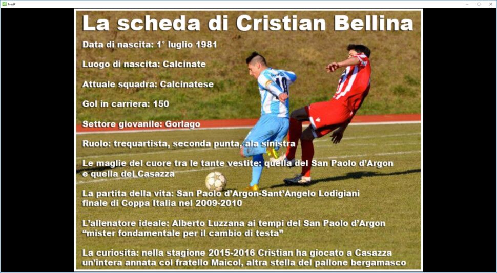 Riportiamo i capitoli che il direttore Matteo Bonfanti ha dedicato a Cristian Bellina nei nostri libri: “Piccole e bellissime storie di grandi attaccanti”, volume che racconta trenta grandi campioni del calcio bergamasco fotografati nella stagione 2015-2016, e “La gente del calcio”, volume che racconta la storia di cinquanta società del nostro pallone.