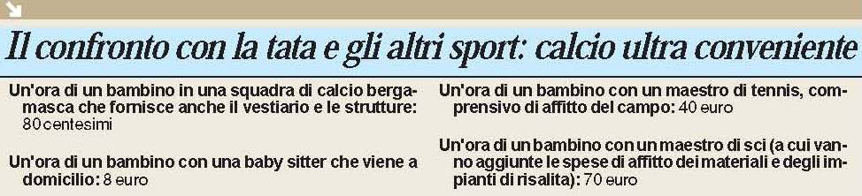 Prima dei numeri, il confronto con una baby sitter e con gli altri sport. Se mio figlio va a giocare a pallone, sarà occupato per almeno cento pomeriggi l’anno (i due allenamenti e la partita, da fine agosto a metà maggio). Mediamente i nostri dirigenti chiedono 250 euro a tesserato. Significa che mi tengono il figlio per tre ore chiedendomi appena 2 euro e 50 centesimi. Tariffa oraria incredibile, 80 centesimi, un decimo di quanto prende la famosa tata (8 euro), un cinquantesimo della paga di un singolo maestro di tennis (40 euro) o di sci (a cui va però aggiunta la salassata per il giornaliero e per l’affitto di sci e scarponi). Sipario quindi su un’inchiesta che tra le righe spiega perché il calcio è la disciplina che pratica più gente in Italia.