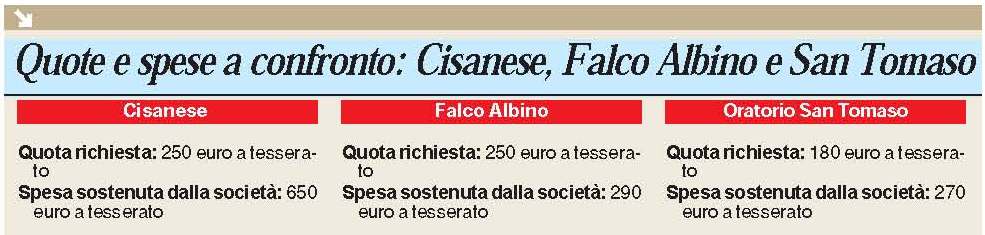 Scendiamo di parecchie categorie, cambiamo zona e guardiamo in casa Falco, altro club bergamasco che da sempre cresce grandi talenti e che, proprio come la Cisanese (pur con le dovute proporzioni), dà maggiore importanza al vivaio piuttosto che alla prima squadra. Sette le formazioni nerazzurre al via nel 2014-2015 e un totale di centoventi giovani calciatori che pagano una quota iniziale di 250 euro e che per la maggior parte sono residenti ad Albino. Ma scopriamo che una buona minoranza arriva da altri paesi della Valseriana. Ed ecco quindi la prima grossa spesa, quella per il pulmino, mille euro per ogni formazione, né più né meno di quel che si spende a Cisano. La maggiore uscita è il campo che la Falco paga perché non è suo, 2mila euro a squadra che è l’identica spesa sostenuta dai dirigenti albinesi per altre tre voci: i cartellini, l’iscrizione ai campionati (e ai vari tornei) e l’abbigliamento. Altre spese non ne hanno, rimborsi chilometrici non se ne danno: tanto si chiede alle famiglie (30-35mila euro), tanto si spende (30-35mila euro). Se poi si trova lo sponsor tra i genitori facoltosi, allora si aiuta chi non ce la fa a pagare l’intera quota e ci si dimentica di chiederla a una ventina di ragazzi che hanno alle spalle famiglie in grossa difficoltà economica.
