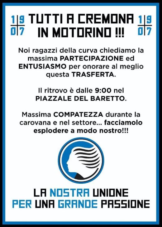 La Curva Nord, che si ritrova a cena a “La Miniera” a Urgnano, in attesa di eleggere direttivo e portavoce nuovi s’è messa sotto con l’organizzazione delle trasferta. Quella a Cremona del primo aprile (ore 15), 2.436 biglietti andati esauriti entro un’ora dall’apertura delle vendite venerdì 24 marzo (alle 16), al riparo salvo contrordine dall’obbligo di tessera del tifoso, è già praticamente fatta: l’invito, piuttosto curioso, è a farla in motorino, partendo alle 9 del mattino di quel sabato dal Baretto di viale Giulio Cesare. L’Atalanta, intanto, chiuso il lavoro settimanale a ranghi ristretti senza 11 nazionali (ancora a parte Djimsiti, Koopmeiners e Vorlicky) durato da martedì a venerdì: si riprende a Zingonia il pomeriggio di lunedì 27 marzo.