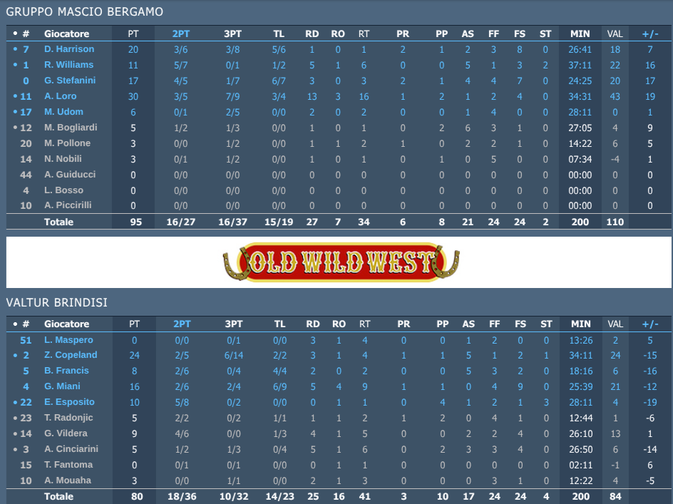 BLU BASKET BERGAMO: Bogliardi 5 (1/2, 1/3), Harrison 20 (3/6, 3/8), Loro 30 (3/5, 7/9), Udom 6 (0/1, 2/5), J. Williams 11 1 (5/7, 0/1); Pollone 3 (0/0, 1/2) , Stefanini 17 (4/5, 1/7), Nobili 3 (0/1, 1/2); N.E. Piccirilli, Guiducci, Bosso. Coach: Alessandro Ramagli.