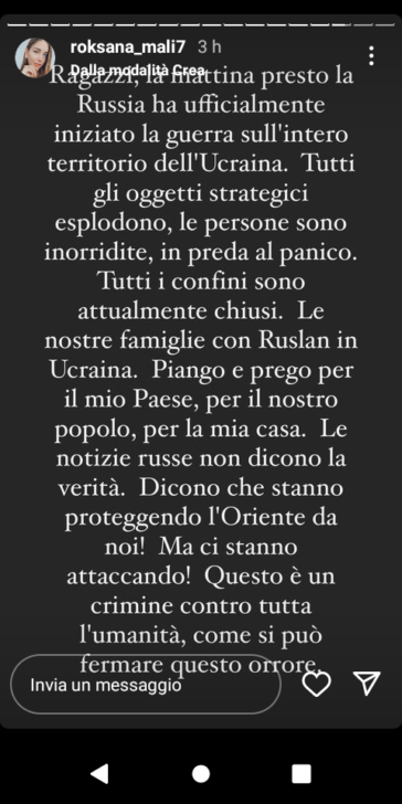 “Questo è un crimine contro l’umanità, come si può fermare questo orrore?”, il messaggio finale. “Tutti gli obiettivi strategici esplodono, le persone sono inorridite, in preda al panico. Tutti i confini sono chiusi, le mia famiglia e quella di Ruslan sono in Ucraina. Piango e prego per il nostro popolo, la nostra casa, la nostra famiglia – si legge -. Le notizie russe non dicono la verità. Dicono che stanno proteggendo l’Oriente (le 2 repubbliche, a est del Paese, ndr) da noi, ma ci stanno attaccando!”.