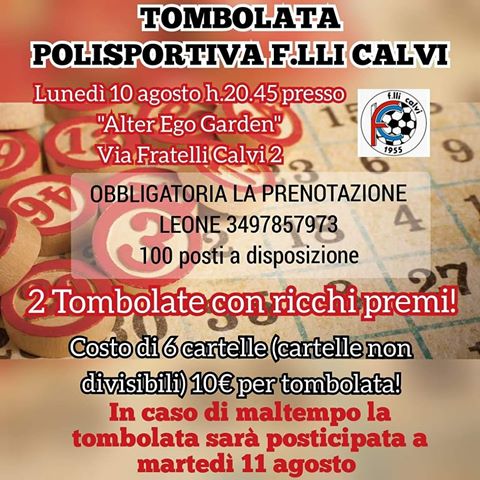 Lunedì 10 agosto (ore 20.45), presso l’Alter Ego Garden di Piazza Brembana (Via Fratelli Calvi 2) la Polisportiva Fratelli Calvi organizza la sua tombolata.