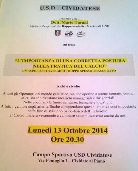 Bergamo – Appuntamento da non perdere lunedì 13 ottobre al campo sportivo di Cividate al Piano. Nell’occasione si terrà infatti un incontro con il dottor Mario Turani, medico responsabile delle rappresentative nazionli LND: tema
