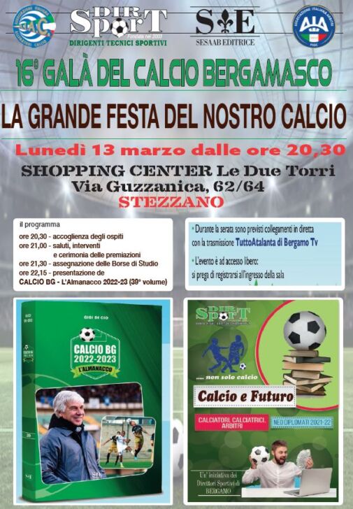 Grande appuntamento lunedì 13 marzo (20.30) allo Shopping Center Le Due Torri di Stezzano, dove sarà presentato l’Almanacco del Calcio Bergamasco 2022/2023 curato da Gigi Di Cio. La serata prenderà il via alle 20.30 con l’accoglienza degli ospiti. Dalle 21 la cerimonia delle premiazioni, alle 21.30 l’assegnazione delle borse di studio targate Dir.Sport e a seguire, appunto, la presentazione del 39esimo volume dell’Almanacco. L’evento è accesso libero.