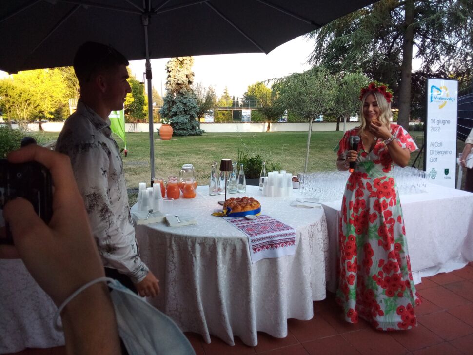 Bergamo – “A Zelenskyi, che non è scappato, dico che il Paese è con lui perché ha scelto di resistere, di vivere in pace, di vivere in Europa e con l’Europa. Non con chi arriva a casa tua e ti occupa il terrazzo”. Parole franche, “anche se per Putin non ho messaggi, chi compie certe azioni se ne assume la responsabilità”, da Ruslan Malinovskyi, animatore con la dolce metà Roksana della Malinovskyi Charity e della serata Ai Colli di Bergamo Golf per pubblicizzare l’attività di beneficenza della famiglia all’Ucraina sotto attacco russo. “Offriamo innanzitutto il nostro pane con sale, è un segno di buon auspicio per gli ospiti, perché non a caso il giallo della nostra bandiera simboleggia il grano col cielo rappresentato dal blu. Sentiamo la vicinanza dei bergamaschi, siamo una cosa sola”, ha premesso la signora Malinovska, proprietaria di Mali Atelier che ha messo in palio un magnifico abito blu uscito dalla sua bottega.